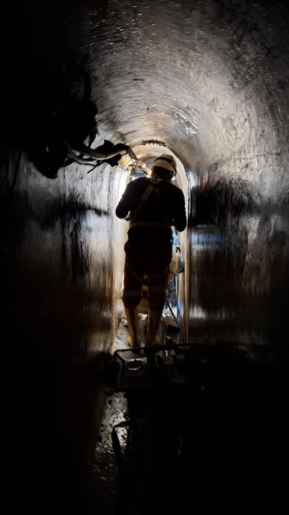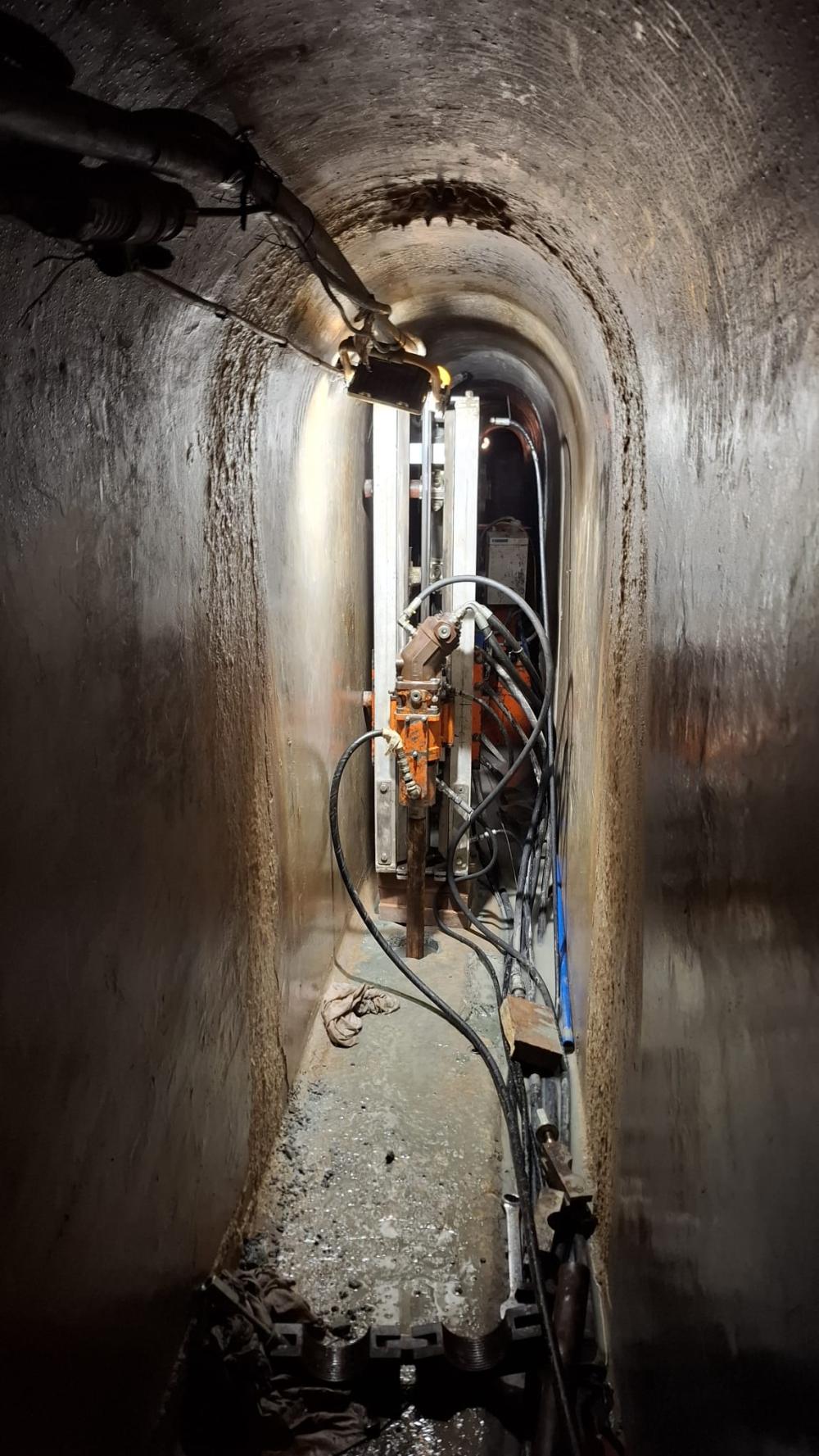 Il cantiere si è sviluppato in condizioni estreme: le operazioni si sono svolte in un cunicolo pedonale a –13 metri rispetto alla piattaforma di accesso, largo appena 60 cm e alto meno di 1,80 m, raggiungibile solo attraverso una botola di 70 x 70 cm. Portare in quel contesto una sonda manuale Puntel MINIDRILL ha richiesto un’organizzazione fuori dall’ordinario, con trasporto in elicottero, calata mediante argano elettrico e infine movimentazione a mano lungo la galleria.